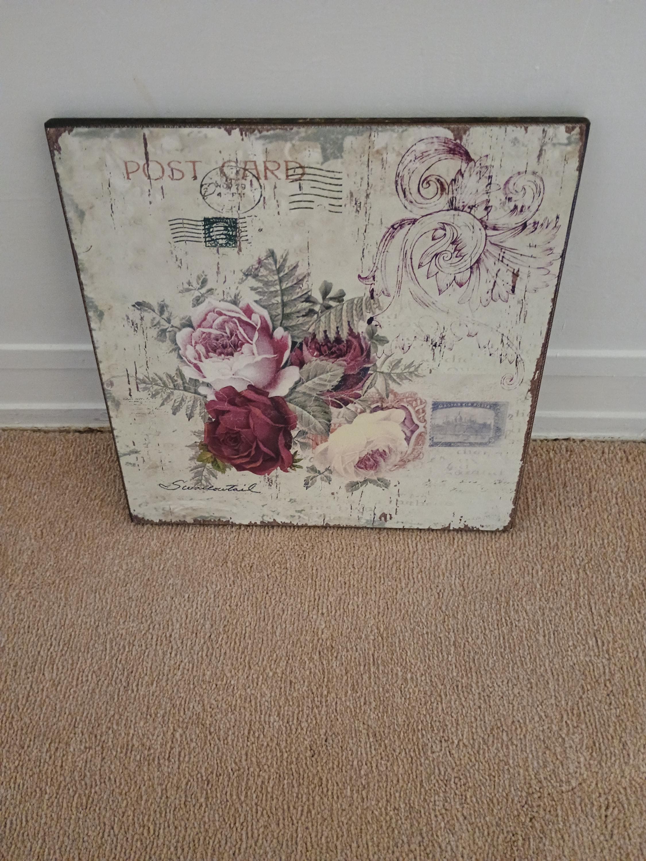 It's a 12 inch x 12 inch "wooden postcard", and you can display it on the wall!